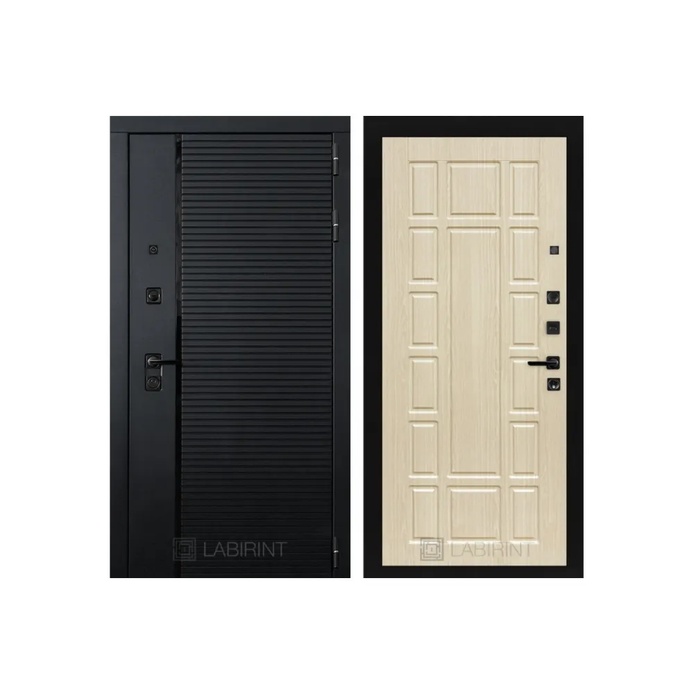 Фурнитура в черном цвете: Броненакладка врезная, накладка со шторкой, глазок , дверная ручка, ночная задвижка. Цилиндр ключ-вертушка Guardian, регулируемый эксцентрик.